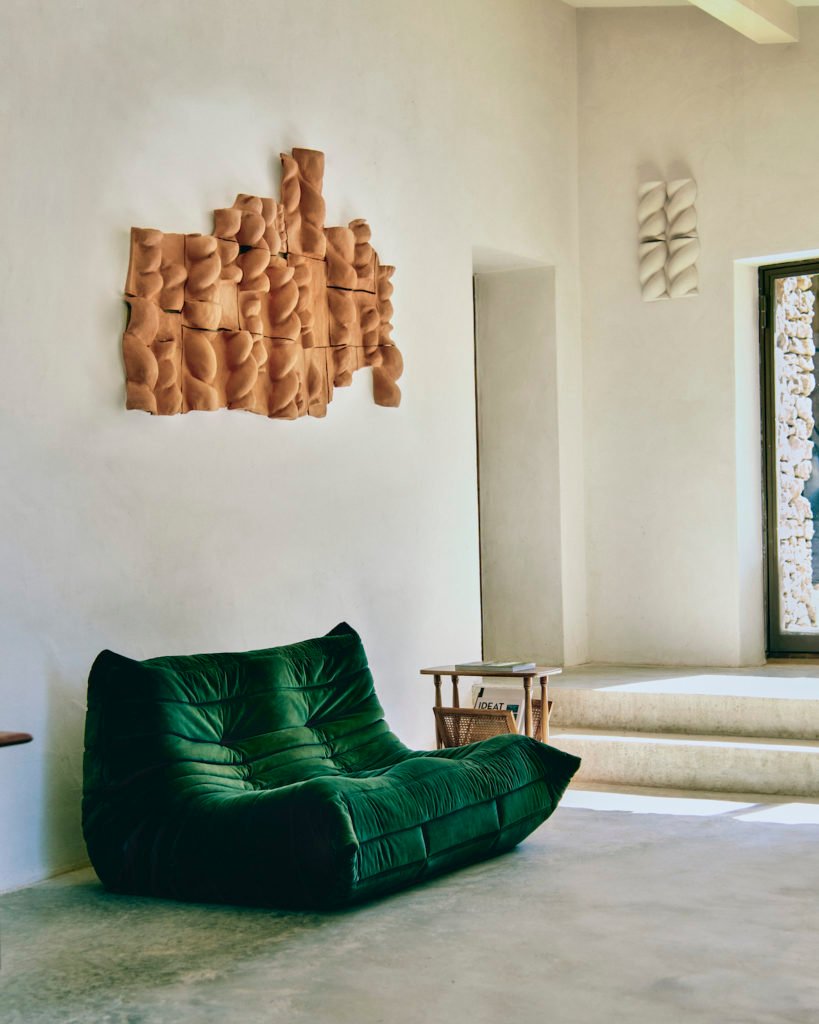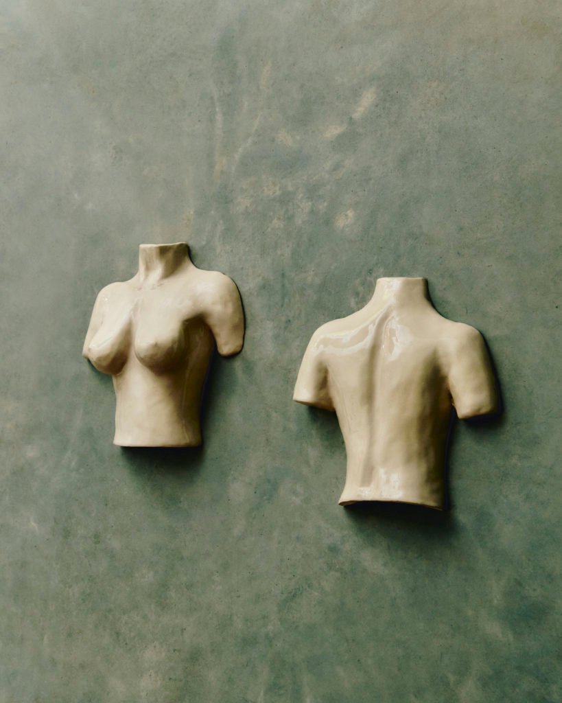 Between Aurélie Fretti and for me it’s a story of dogs and babka. No connection, one might say, except a real crush on this ceramist and sculptor who goes by the name of Di Fretto, as funny as she is talented, a former Parisian pubard who fled to the heart of the Lubéron a year ago with her three dogs, her man and her children. A place in his image, pure, simple and aesthetic that I hope to show you one day, a real playground where he gives free rein to his creativity. Of Italian origin on her father’s side and Polish on her mother’s side, Aurélie draws on these two cultures which she infuses into her work. On the one hand, a tribute to the bodies of antiquity, to the statues that he brings to life and that he deviates in his own way in reference to Italy with busts, upside-down heads transformed into lamps or vases, which invite the vocabulary of this era to play with current codes. On the other, a dive into childhood with Babka, one of his flagship pieces which he brought to life in homage to the famous Polish brioches of the same name. Superb pieces that we find in particular on this graceful table lamp, modeled in a white chamotte earth that takes the form of a twist with an irregular rendering that also evokes the vortices of life. But Babka also has ceramic or even wooden appliques that he cuts with a chainsaw and sculpts, wall sculptures or even molds that he transforms into appliques. Plot twists found in the oversized handles of his brightly colored enamel cups, which he also transformed into vases. From the cup to the wall fresco, Aurélie does not impose limits on herself and follows her desires, which she gives shape using different techniques that she learns during her creations. It is for all these reasons that I really wanted to present to you the poetic and inspired universe of this artist who is not afraid of anything, who exudes strength and fragility and who has the delicacy to shape pieces as beautiful as they are useful. My Babka lamp arrived in our living room a week ago; I look at it differently every day, I twisted, in agreement with Aurélie, its lampshade by twisting it with wool threads which add a material and softness that I like but the original one is in linen. Through several photos I will let you discover the world of Aurélie, her creations and of course her dogs, a topic of conversation that binds us now like this beautiful lamp, which spreads its grace and its light in our interior.