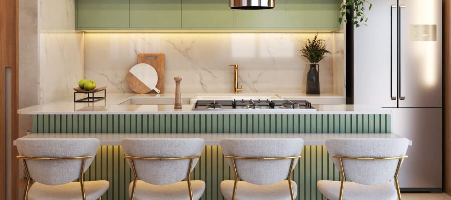 A light green shade was used in this kitchen design. The combination with gold has left room charming and sophisticated.