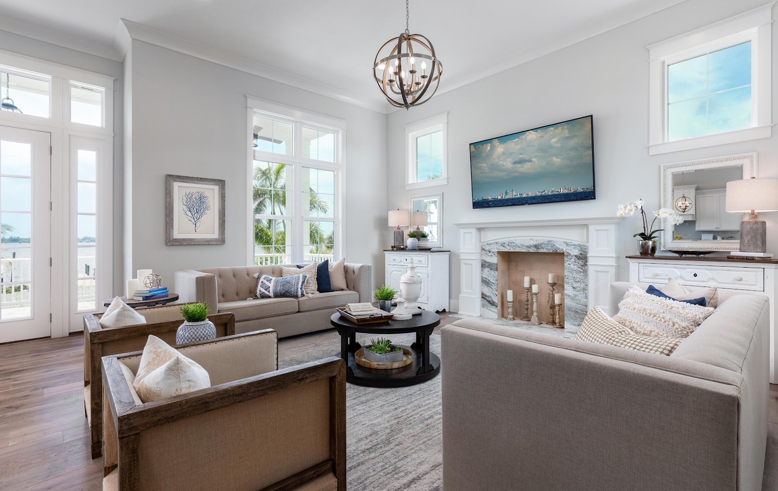 Paying attention to lighting is one of the keys to a successful layout. Maximize natural light for the day and add plenty of layering options for the evening, from functional lighting to cozy table lamps or ambient sconces, to sculptural pendant lighting that serves as decoration. Make sure you illuminate all four corners of the room to avoid creating shadows and promote a sense of well-being after dark.