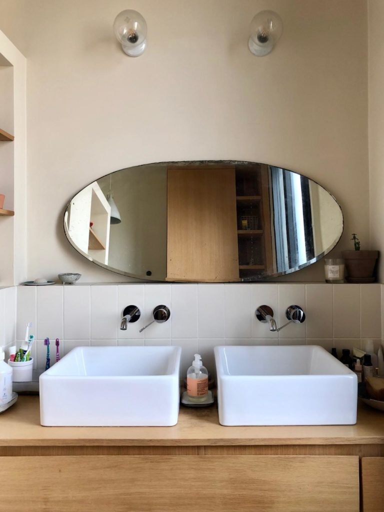 In the completely redesigned bathroom, custom-made vanity unit by Atelier Barbier. Zangra wall lamps. Eggshell painting, Peintures de Paris.